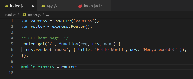 화면은 jade 방식이라는게 있나 보네요? 저는 그냥 vue.js 쓸거라서 그냥 넘어갈게요
